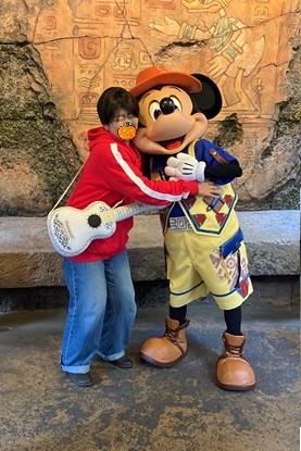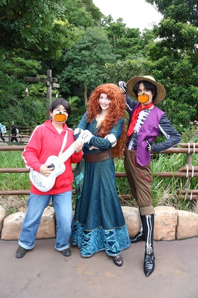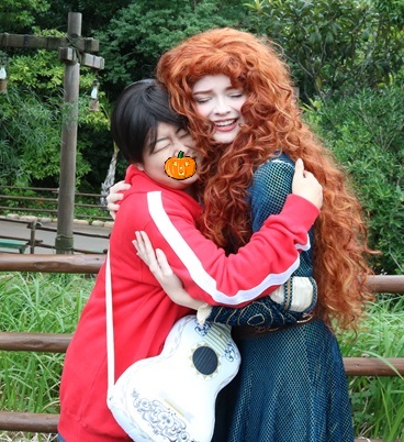 | 初めてグリーティングでメリダに会いました! メリダはミゲルのギターに興味をあるようで「リメンバー・ミー」の曲を歌いました♪ 思いっきりハグもしてもらい大満足のミゲル☆ |