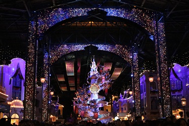 | ↑ 夜のワールドバザールと、エントランスのモニュメント キラキラして光いっぱいで綺麗でした♪ ↑ |