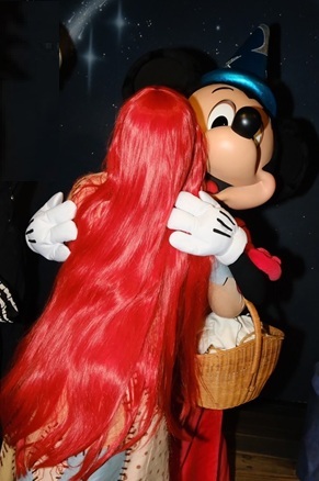 | 朝、入園して最初に行ったのがミート・ミッキー。 まずはミッキーにご挨拶がしたい。 今日はファンタジアの衣装でした。 ハグもしてくれて、いつも優しいミッキー☆ |