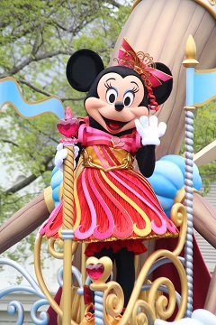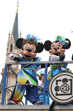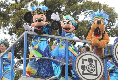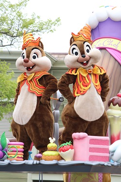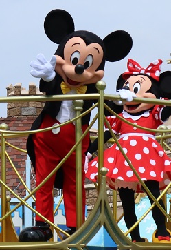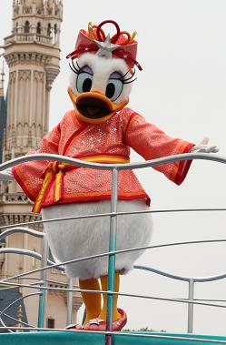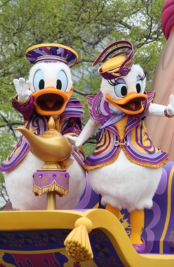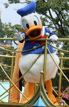 | 時間不定期のパレードを見られました。 1フロートのみですが、ミッキーとドナルドがこっちを向いてくれました♪ |